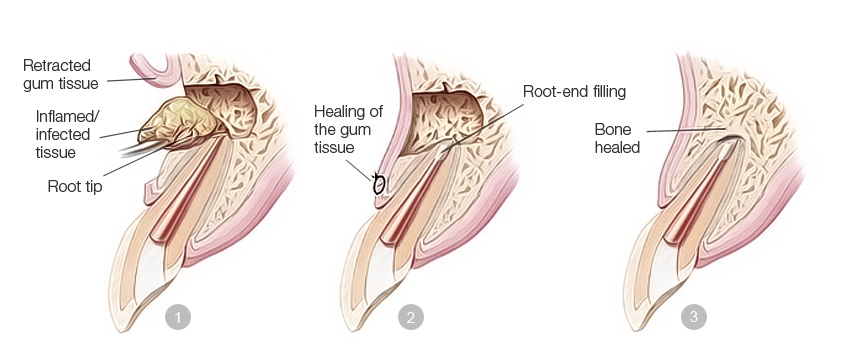 A fog gyökérének környezetében lévő gyulladásos szövetek maradék nélküli eltávolításához szükséges levágni a fog gyökerének egy részét is. Helyi érzéstelenítésben minden fájdalom nélkül elvégezhető. Egyetlen kellemetlenséget, mint minden más fogászati beavatkozás során a hangok okozzák. A műtét a nyálkahártya lefejtésével kezdődik, majd a fog gyökerének és esetleg kevés csont eltávolításával folytatódik. Ezután kitakarítjuk a gyulladt területet. Ezt követően, ha szükséges innen a gyökér felől is lezárjuk a gyökércsatornát (retrográd gyökértömés). Ha az üreg túl nagy, akkor a biztonságosabb csontosodás érdekében csontpótló anyagot is helyezünk bele, amit membránnal fedünk. A műtét végén a sebszéleket varrattal egyesítjük.
